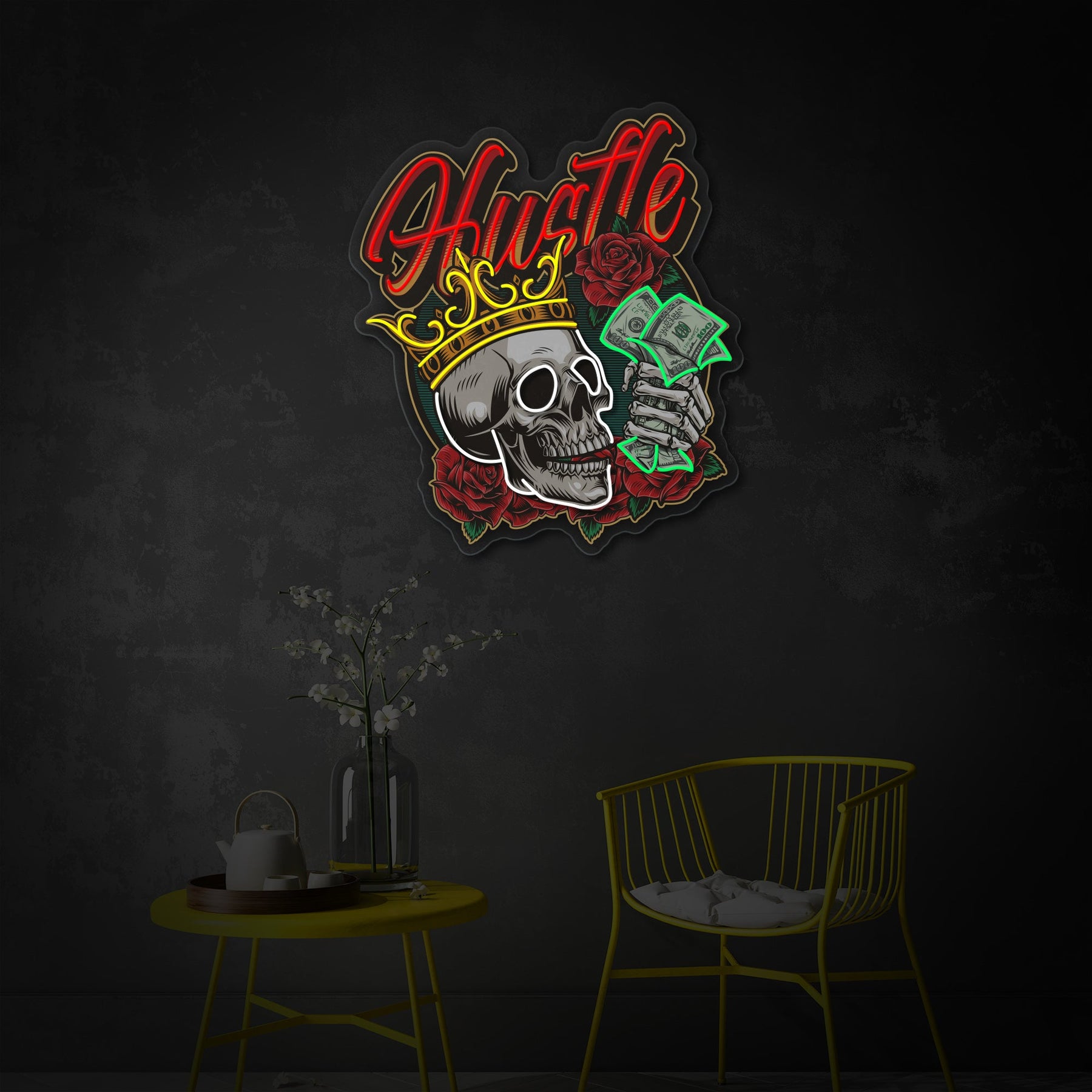 "Kraniet i kronroser skelet hånd holder dollarsedler" UV-printet LED-neonskilt